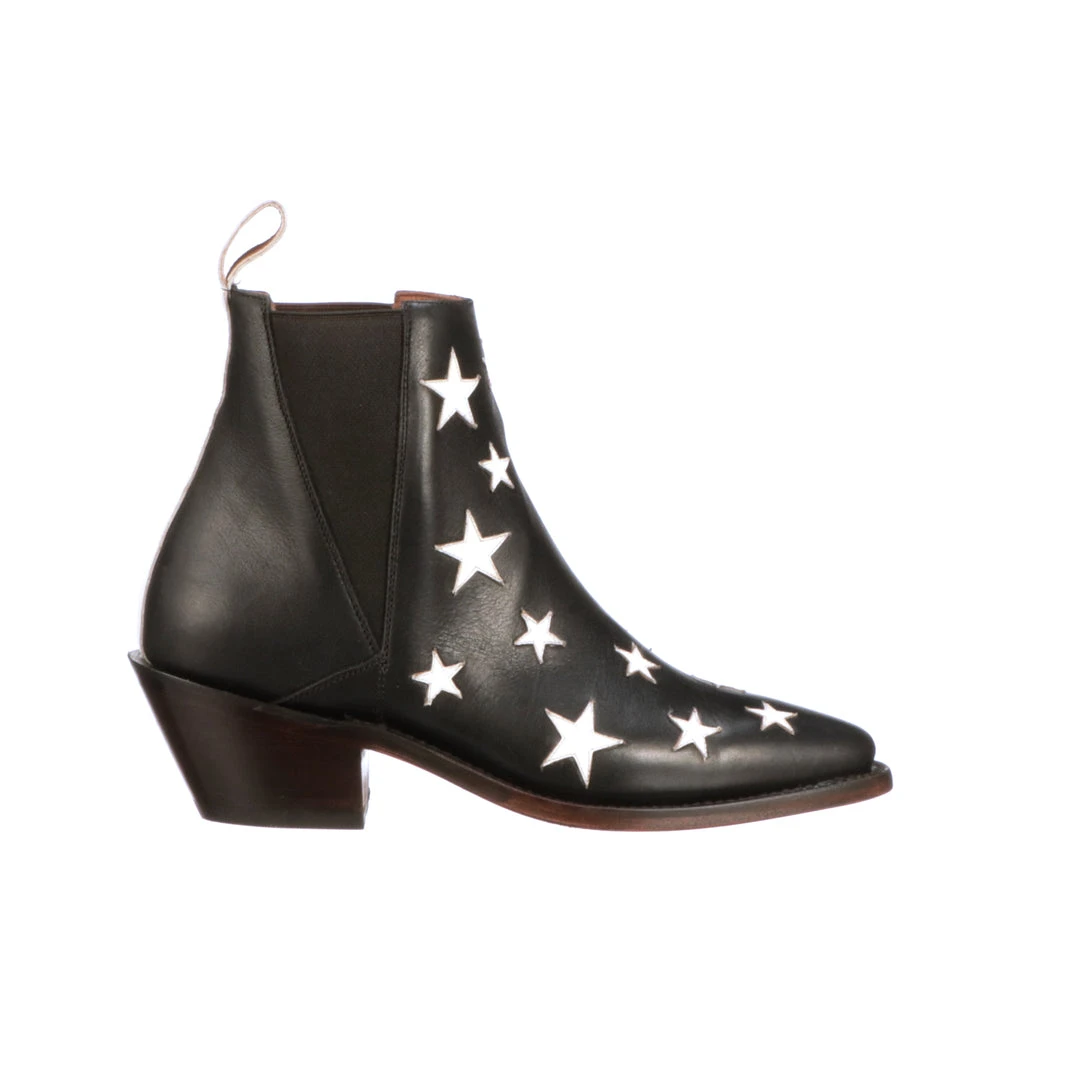 Estrella Chelsea is a modern take on the Chelsea boot. With twin goring, the bootie is easy to pull on and wear all day. The inlaid stars playfully dance along the foot for an artful detail. Full single stitch welt construction. Leather sole. Handmade in Mexico.